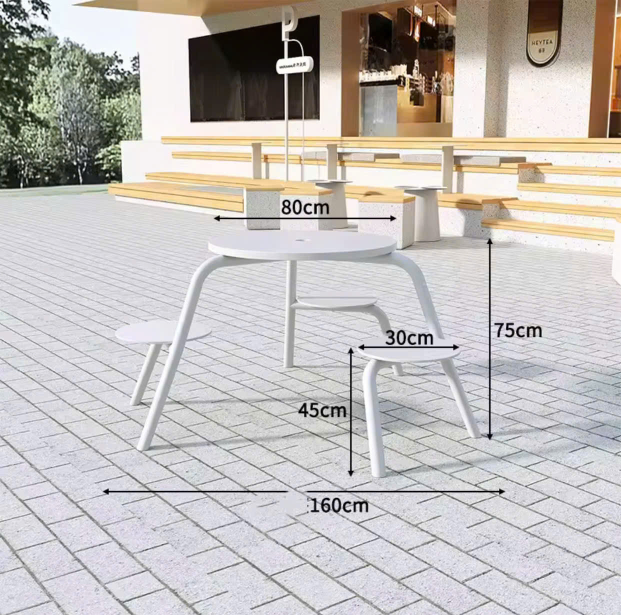 Tính năng: Một bộ liền khối gồm bàn và ghế, bàn có khoan lỗ để cam ô, ghế có khoan lỗ để thoát nước, lắp đặt sử dụng ngoài trời không phai màu.