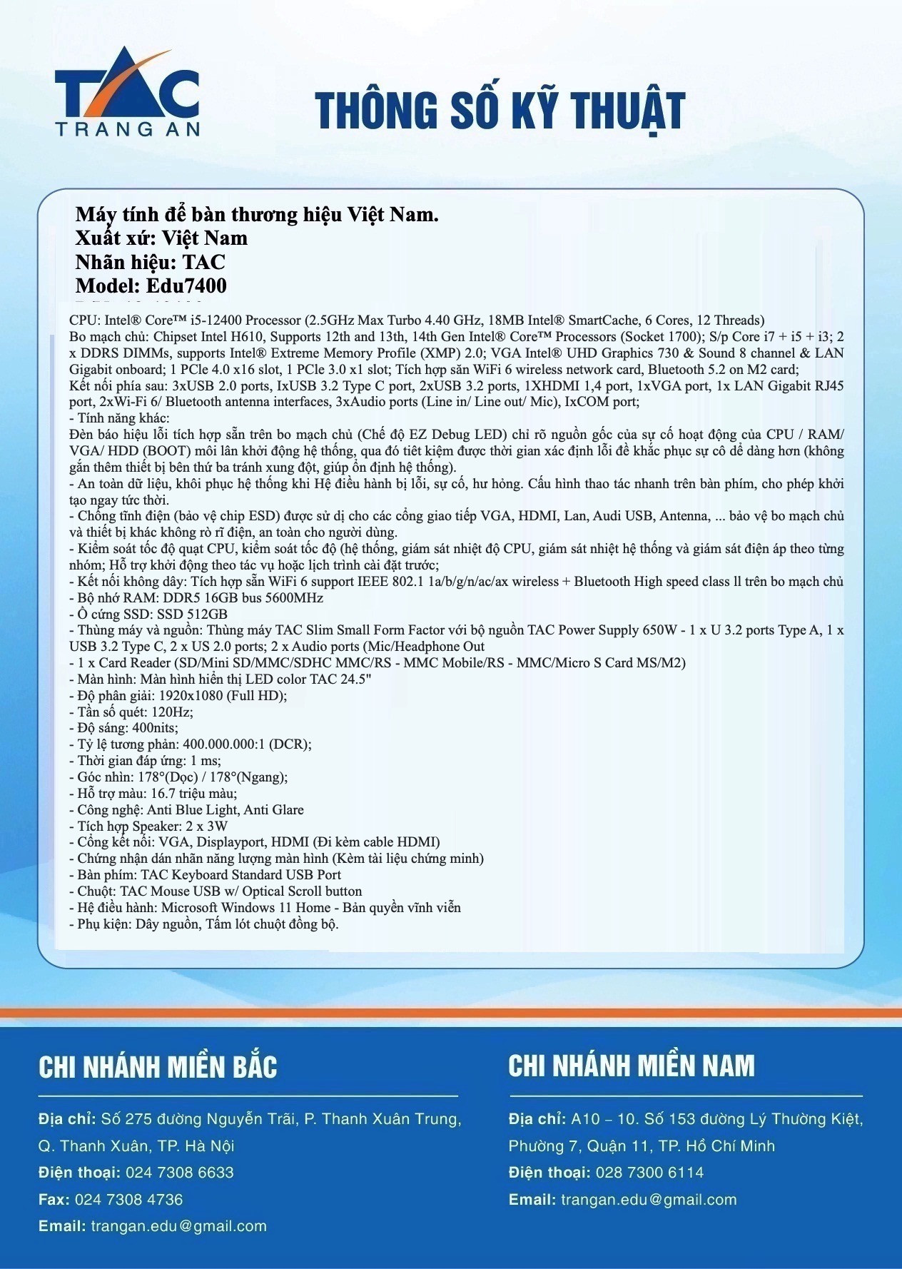 - Thùng máy và nguồn: Thùng máy TAC Slim Small Form Factor với bộ nguồn TAC Power Supply 650W - 1 x U 3.2 ports Type A, 1 x USB 3.2 Type C, 2 x US 2.0 ports; 2 x Audio ports (Mic/Headphone Out